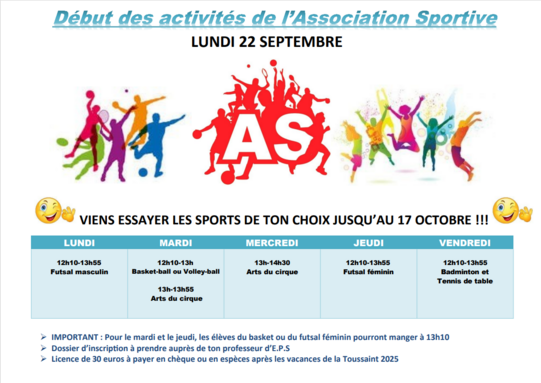 Par Admin Clemence Isaure, publié le jeudi 25 septembre 2025 09:49 - Mis à jour le jeudi 25 septembre 2025 09:55L'association sportive du collège redémarre ! Début des activités le lundi 22 septembre. -