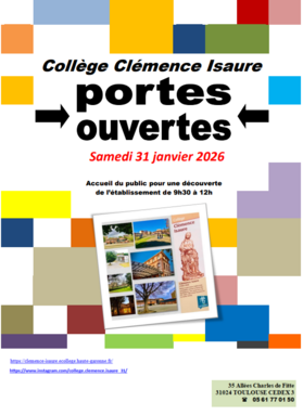 Par Admin Clemence Isaure, publié le mardi 20 janvier 2026 13:40 - Mis à jour le mardi 20 janvier 2026 13:40Journée portes ouvertes au collège Clémence Isaure le samedi 31 janvier 2026 de 9h30 à 12h. -