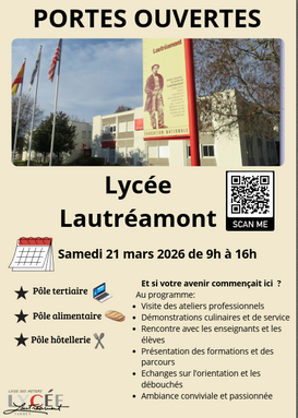 Le lycée Lautréamont, lycée international des métiers de l'hôtellerie restauration, de l'alimentation et du tertiaire a le plaisir de vous inviter à sa journée Portes Ouvertes qui se déroulera le samedi 21 mars 2026 sans interruption, de 09h00 à 16h00.