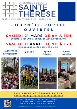 - le samedi 21 mars 2026 de 9h00 à 13h00 pour l'école maternelle et primaire, le collège, le lycée général et le lycée hôtelier